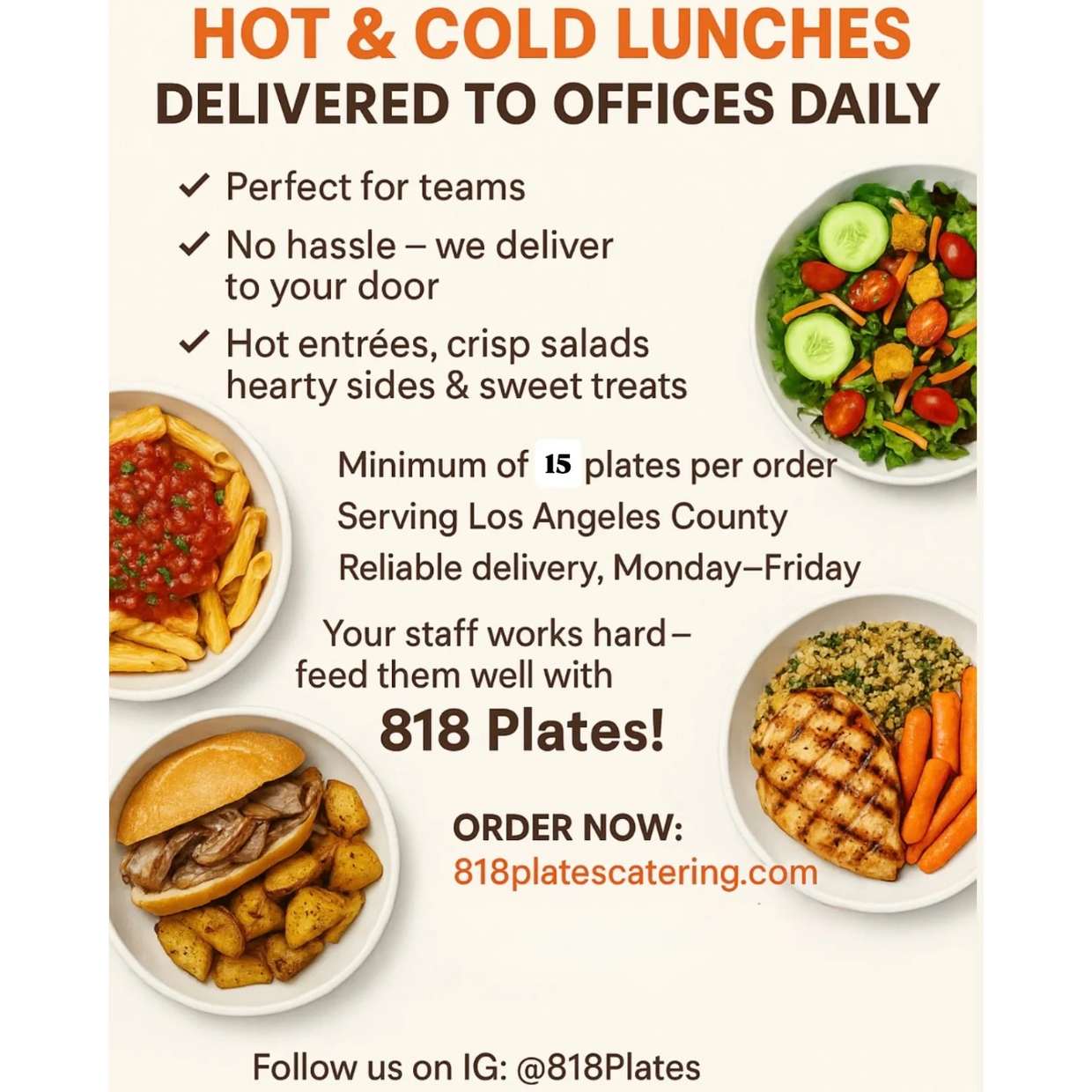 Tired of the same lunch routine? Let 818 Plates bring the flavor to your office with hot & cold lunches delivered fresh daily!